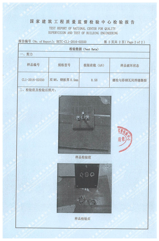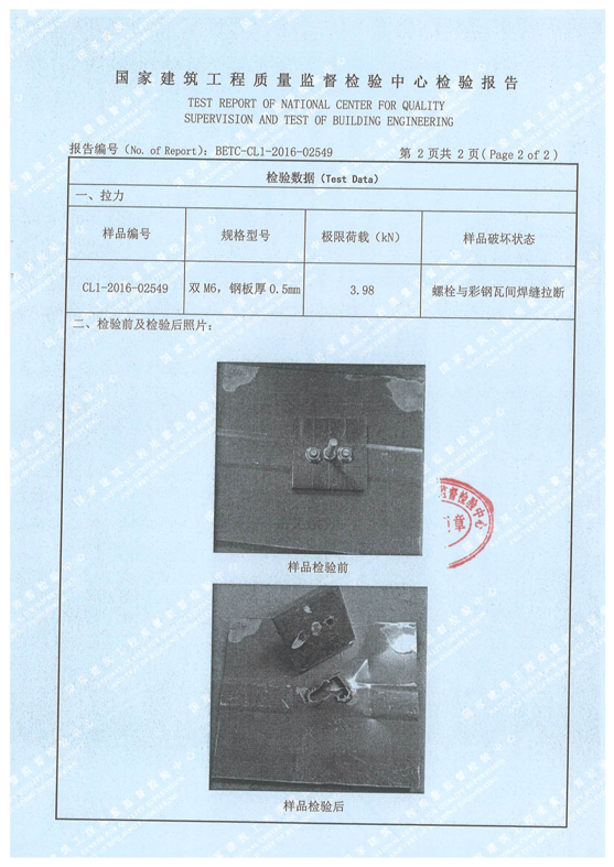 專用焊接螺栓焊接荷載己經(jīng)過中國國家建筑工程質(zhì)量監(jiān)督檢驗(yàn)中心的檢測(cè)。根據(jù)力學(xué)計(jì)算,在38.9m/s颶風(fēng)時(shí),作用在光伏組件上的風(fēng)壓為570N, 新型支架焊接連接點(diǎn)的極限拉力荷載為:4020N, 極限剪力荷載為:6320N,己大大超過其理論設(shè)計(jì)值。