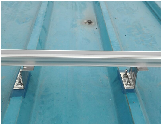 傳統(tǒng)的方案,在夾具與梯形彩鋼瓦瓦楞之間放置防水膠條或涂刷防水膠后在打孔加螺栓或鉚釘或強(qiáng)力膠粘接的連接方式,有施工工序復(fù)雜 , 使用的零部件多 , 施工時(shí)間長以及原材料成本高的問題。還有因彩鋼瓦的型號(hào)較多,各型號(hào)的彩鋼瓦瓦楞截面尺寸各異 , 各型號(hào)彩鋼瓦的夾具基本不能通用,使得彩鋼瓦屋面光伏支架結(jié)構(gòu)在安裝過程中裝配復(fù)雜,每種彩鋼瓦需要根據(jù)其截面形狀生產(chǎn)相應(yīng)截面形狀的夾具,夾具生產(chǎn)所需模具較多,增加了生產(chǎn)成本.
